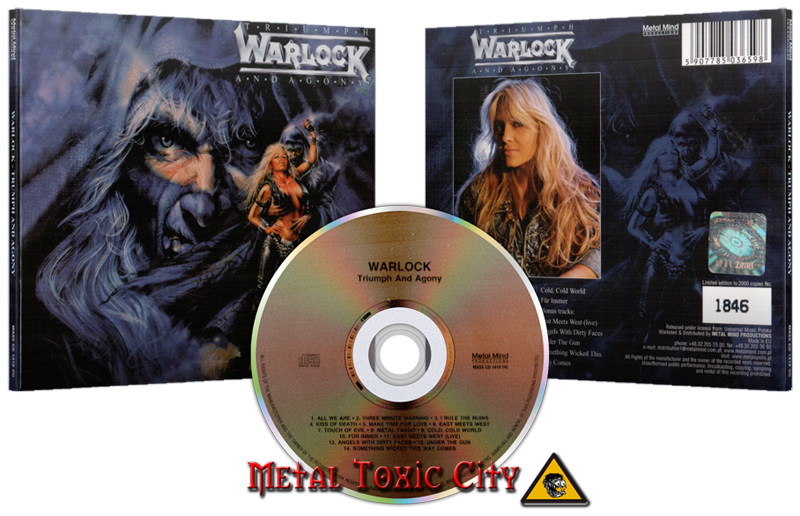 Warlock (DEU) • Triumph and Agony (1987) [Digipak Limited Edition Remastered 2011] Band: Warlock Album: Triumph and Agony Version: Limited Edition, Numbered, Reissue, Remastered, Digipak, Gold Disc Genre: Heavy Metal Format: MP3@320kbps / FLAC@982kbps (cue+log+covers) Scans: Complete 1.- All We Are 2.- Three Minute Warning 3.- I Rule the Ruins 4.- Kiss of Death 5.- Make Time for Love 6.- East Meets West 7.- Touch of Evil 8.- Metal Tango 9.- Cold, Cold World 10.- Für immer 11.- East Meets West (Live) * 12.- Angels with Dirty Faces * 13.- Under the Gun * 14.- Something Wicked This Way Comes * * Bonus Track